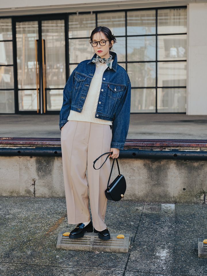 さりげない襟元のバンダナ使いでスタイリッシュと防寒を両立。Gジャンのカジュアル感をかっちり系シューズとバッグで大人っぽく、どこかクラシカルなテイストにまとめるのが正解。
