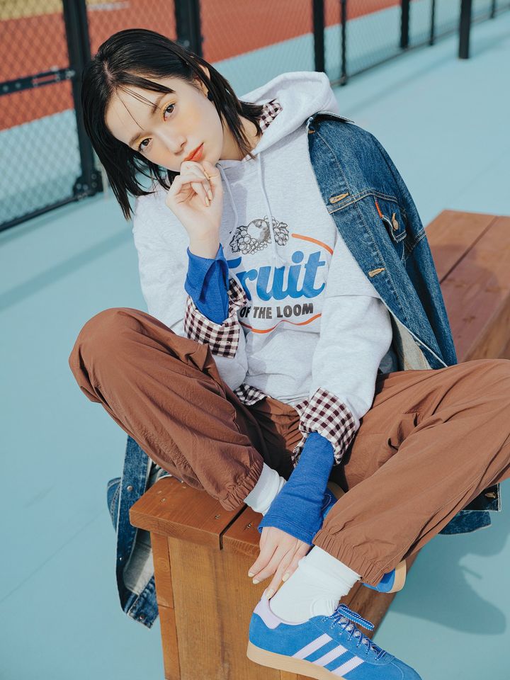 佐藤栞里。ar1.2月合併号より。 Gジャン¥ 18,700/アングリッド Tシャツ¥3,190/フルーツオブザルーム(ギャレット) スウェット¥5,445/ユナイテッドアスレ(キャブ) シャツ¥41,800、ロンT ¥18,700/フィーニー パンツ¥18,000/TW ピアス¥29,700/セシル・エ・ジャンヌ(セシル・エ・ジャンヌ 青山店) スニーカー¥15,400/アディダス(アディダスお客様窓口) ソックス/スタイリスト私物