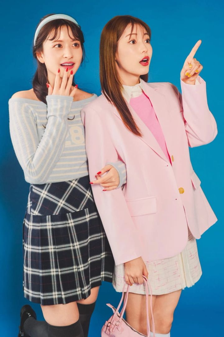 学生風の王道・チェックのミニがエモ可愛い(左・金川紗耶のコーデ)