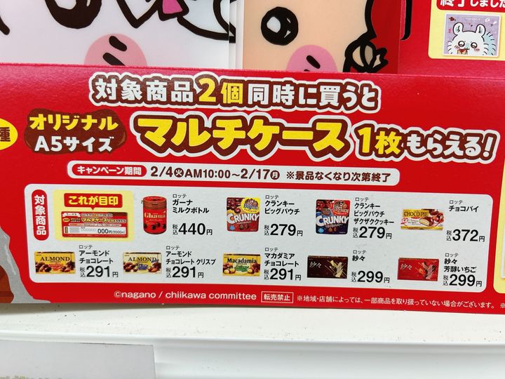 ガーナやクランキー、チョコパイなどの対象商品を2点買うともらえます。