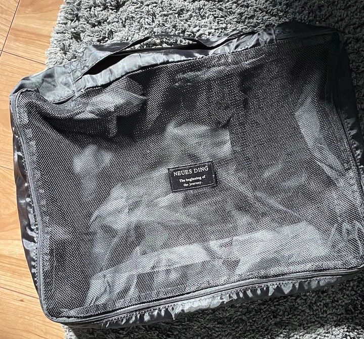 スリコでGETした衣類圧縮バッグ。秋冬はニットやスエットなど、かさ張るアイテムが多いので、パッキングに圧縮袋は必須。なんといってもイチオシポイントは……表面がメッシュ素材になっていて、中身がパッとひと目で確認できるところ。さらに、丈夫なポリエステル素材で、水に濡れても安心! 旅行だけでなく、キャンプやサウナ、プールなど、レジャーシーンにも使えそう。万が一汚れても、洗濯ネットに入れて、弱モードならマシンウォッシャブルもOKなので、衛生面が保てるのも嬉しい。ちなみに、ひと周り小さいSサイズもありました。