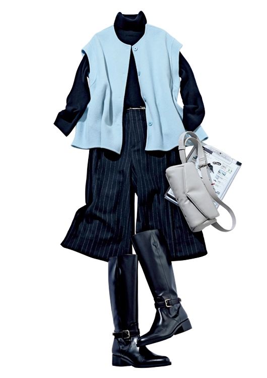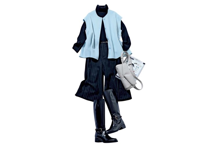 打ち合わせの日はライトブルーの印象を強めてさわやかに。タートルとスカート、ブーツの黒で縦長シルエットにまとめ、スタイルアップを強化。