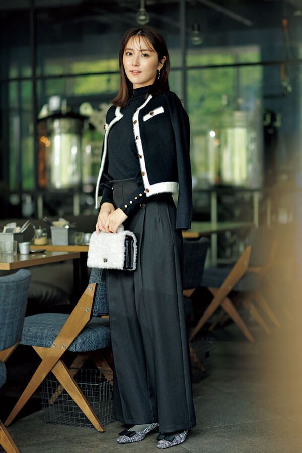 パンツ¥6,490/アストリア オディール(アストリア オディール ルミネエスト新宿店) ニットジャケット¥3,590、ニット¥2,990/ともにAlotta ピアス¥16,500/ランバン オン ブルー(ヴァンドームヤマダ) バッグ¥14,850/ダイアナ(ダイアナ 銀座本店) タイツ¥1,100/満足(福助) 靴¥12,650/アルテミス by ダイアナ(アルテミ ス by ダイアナ アーバンドック ららぽーと豊洲店)
