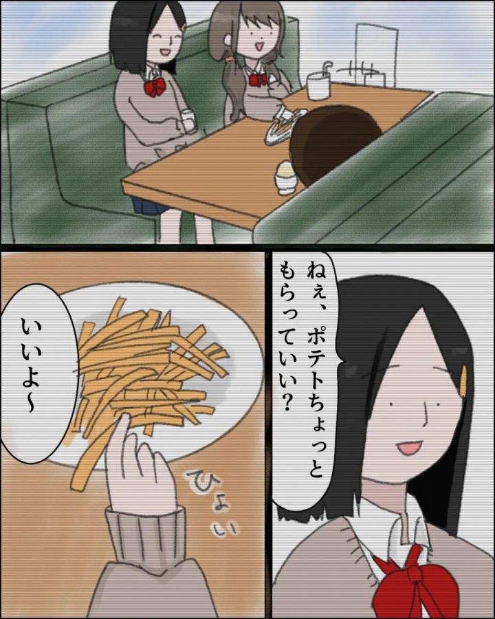 「ねぇ、ポテトちょっともらっていい?」マリちゃんが友達に聞くと快く「いいよ~」と返事がきました。