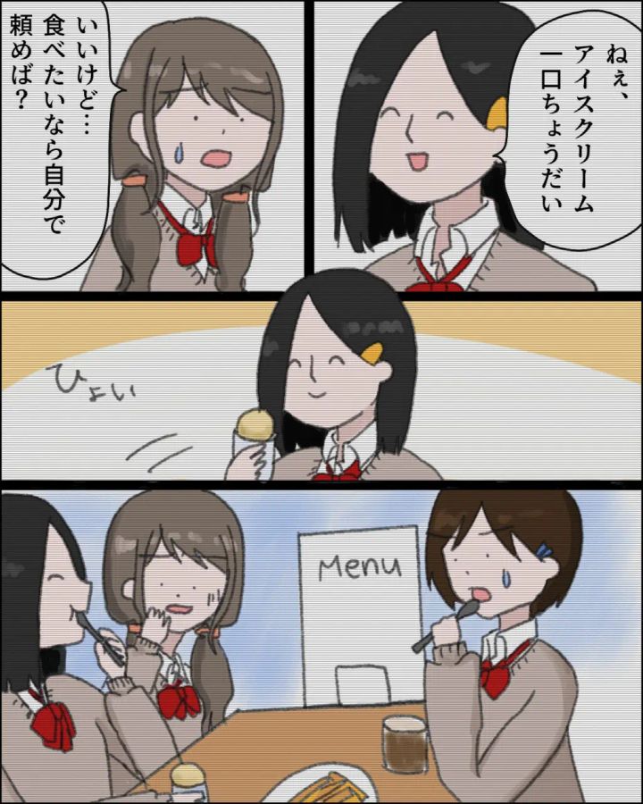 「いいけど・・・食べたいなら自分で頼めば?」と友達は言いますがマリちゃんは無視して一口アイスクリームを口に運びました。