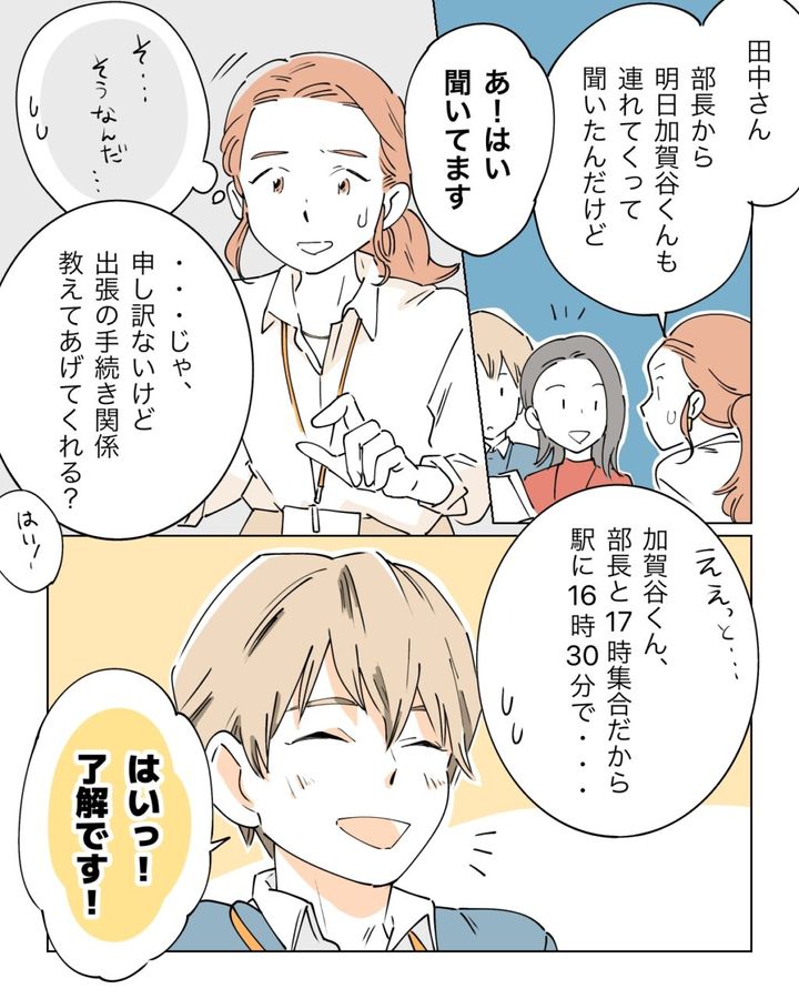 「田中さん、部長から明日加賀谷くんも連れてくって聞いたんだけど」田中さんにそう言うと、「あ!はい聞いてます」と即答され、「そ・・そうなんだ・・」と思いながら「・・じゃ、申し訳ないけど出張の手続き関係教えてあげてくれる?」と田中さんに頼み、「ええっと・・加賀谷くん、部長と17時集合だから、駅に16時30分で・・」と言うと「はいっ!了解です!」と笑顔で答える加賀谷くん。