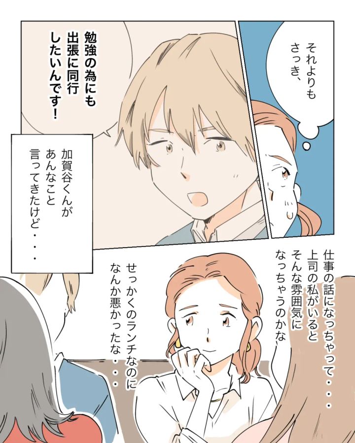 「それよりもビックリしたのは・・さっき『勉強の為にも出張に同行したいんです!』って加賀谷くんが言ってきたこと・・」「仕事の話になっちゃって・・上司の私がいると、そんな雰囲気になっちゃうのかな。せっかくのランチなのに、なんか悪かったな・・」となんだか申し訳ない気分になったのでした。