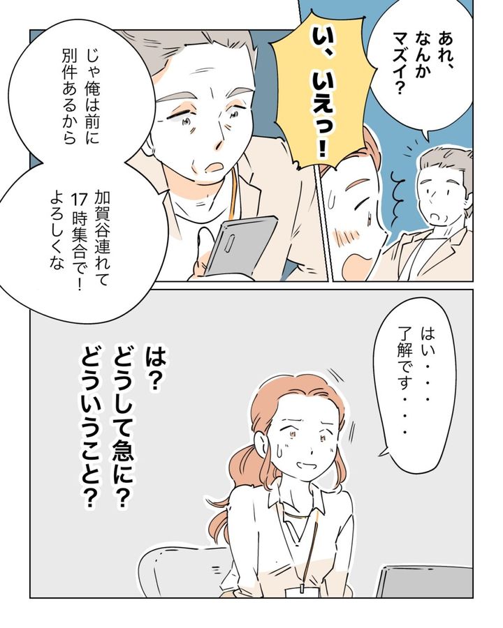 思わず「え」と言うと、「あれ、なんかマズい?」とたずねられ慌てて否定。その後「じゃ俺は前に別件あるから、加賀谷連れて17時集合で!よろしくな」「はい・・了解です・・」と答えたものの、行ってしまった部長を見送りながら、「は?どうして急に?どういうこと?」と訳がわからず。