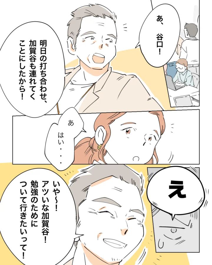 その後、「あ、谷口!明日の打ち合わせ、加賀谷も連れてくことにしたから!」部長にそう言われて「あ、はい・・」と驚くと、「いや~!アツいな加賀谷!勉強のためについて行きたいって!」と嬉しそうな部長。