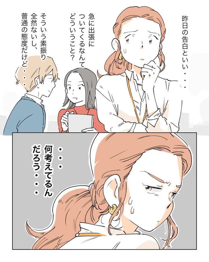 「昨日の告白といい・・急に出張についてくるなんてどういうこと?そういう素振り全然ないし、普通の態度だけど・・」そんな風に思いながら「・・本当何考えてるんだろう・・」という気持ちでいっぱいになりました。