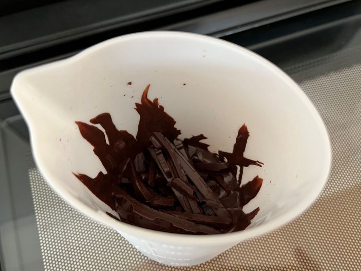 加熱時間の目安は、チョコレート50gなら500Wで1分。取り出すと、チョコの表面は溶けている感じがしますが……どうでしょうか。