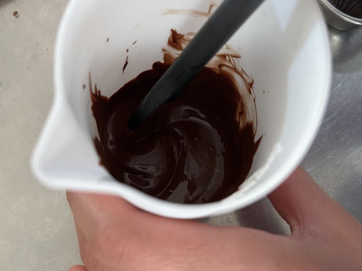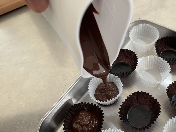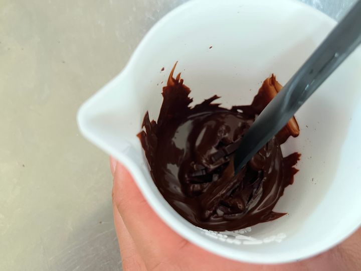 溶けたチョコも、片手でミニカップに移せます! シリコーンカップはやわらかいから、注ぎ口の角度を調整しやすいのもメリット。中身の量が少なくなってきたら、口先を細くすると注ぎやすくなりました。