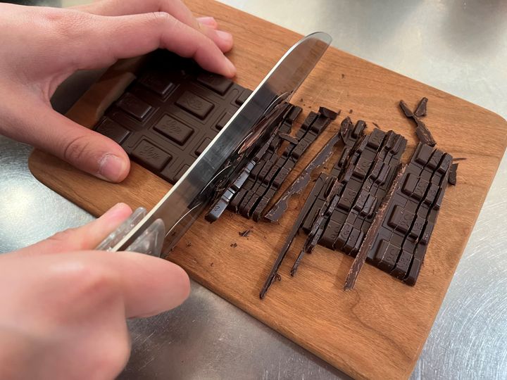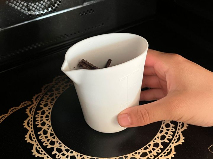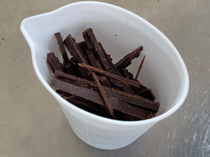 チョコレート50gを刻んで、カップへ。こちらも上限はカップの半分程度なので、板チョコ1枚がちょうどいい量です。
