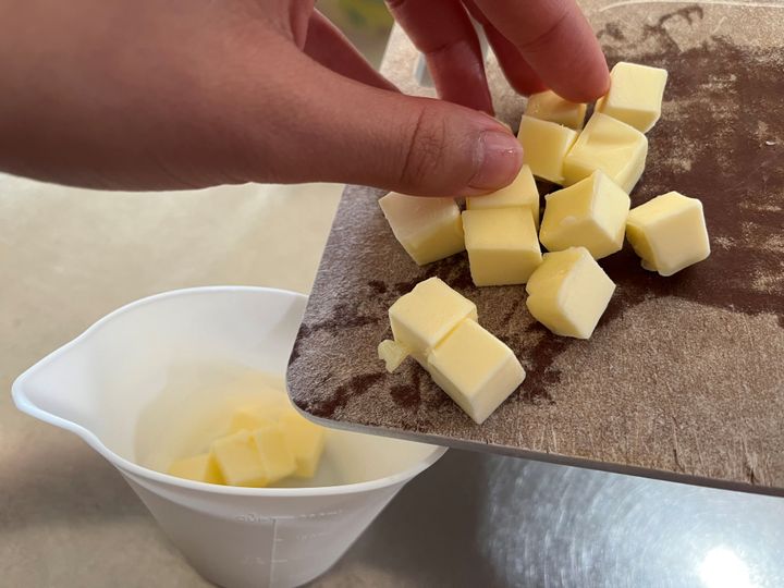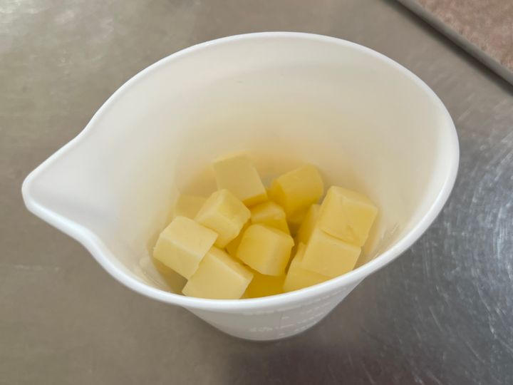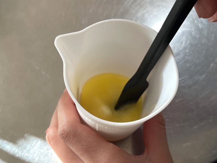 バレンタインスイーツ作りの予習を兼ねて、早速、ムスメといっしょに使ってみました。まずは、焼き菓子を作ってみようかな……ということで、マドレーヌの生地に必要な溶かしバターを作ります。