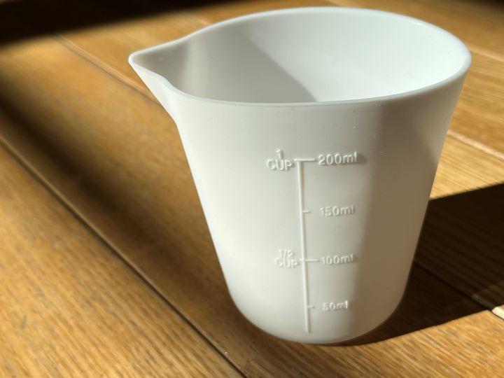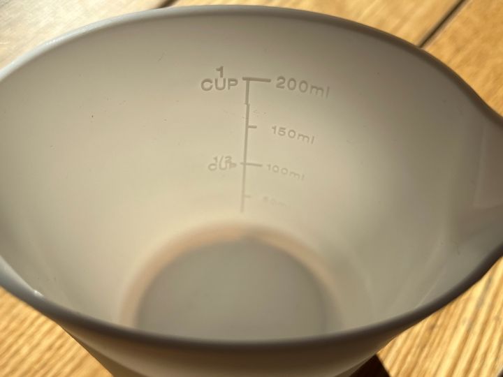 容量は250ml。200mlまで外側にも内側にもメモリがついているので、計量カップの役割もこなせます。