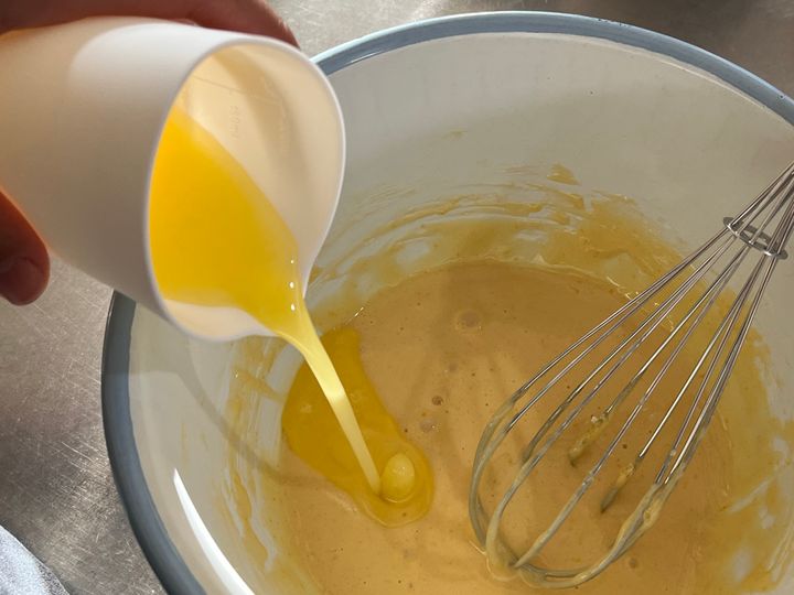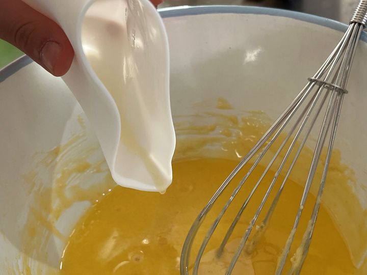 カップの注ぎ口から、卵、砂糖、小麦粉を混ぜたボールに投入!