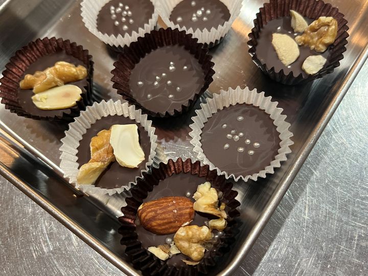 ナッツやアラザンをのせて冷蔵庫で冷やし固めたら、こんなにきれいな表面に! ばらまきチョコとしては上出来~♪