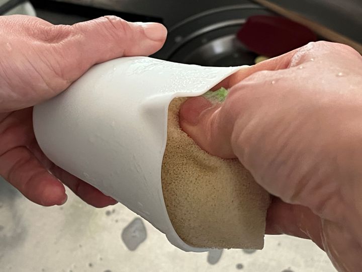 このカップは白いので、チョコを溶かしたあと色移りするかな?と心配したのですが、内側がかなりつるっとしているので、食器用洗剤をつけたスポンジ+お湯で汚れはなんなく落とせました。むしろ洗うものがこれだけなんてうれしい!