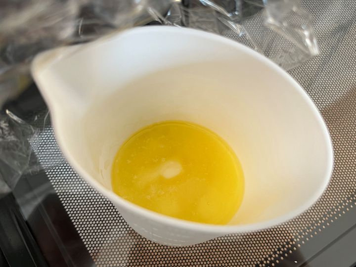 加熱時間の目安は、バター30gなら500Wで20秒程度とのこと。50gなので、まずは30秒加熱してみました。