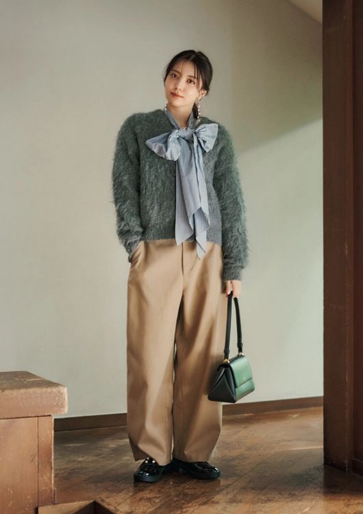 ニット、パンツ各¥8,990/アンフィーロ(オンワード樫山) ボウタイブラウス¥20,900/ニコルソンアンドニコルソン(シップス) イヤリング¥5,170/フェリーチェ(ロードス) バッグ¥56,100/ケイト・スペード ニューヨーク(ケイト・スペード) シューズ¥19,250/ダイアナ(ダイアナ 銀座本店)