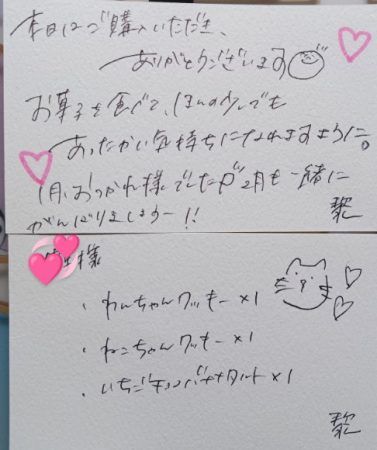 取り置きをお願いしたら中に入っていたメッセージカードです。温かみのある黎。皆さんも是非行ってみてね‼