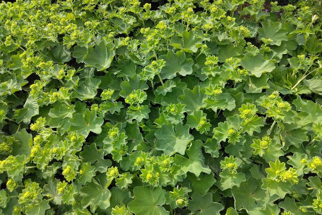 黄緑色の小花が房のように咲くアルケミラモリス。葉の形が聖母マリアのマントのように見えることから「レディースマントル」とも呼ばれています。このことから「献身的な愛」という意味が付いたのかもしれません。