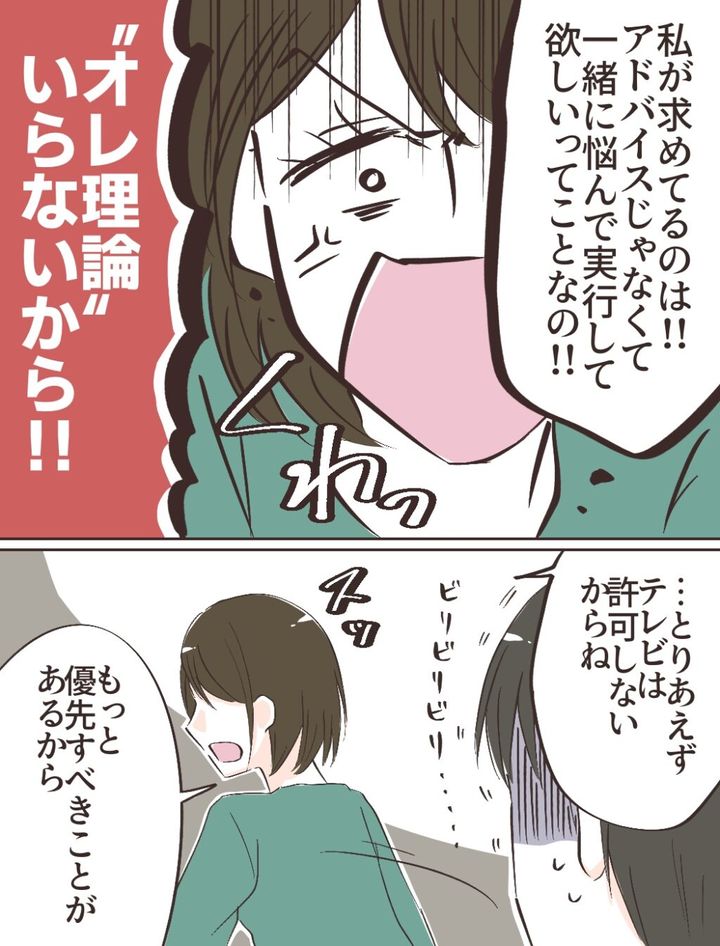 「私が求めてるのは!!!アドバイスじゃなくて、一緒に悩んで実行して欲しいってことなの!!『オレ理論』いらないから!!」とかなりの圧で訴えるとビビりまくるショウヘイ。「・・とりあえず、テレビは許可しないからね。もっと優先すべきことがあるから」とキッパリ伝えました。