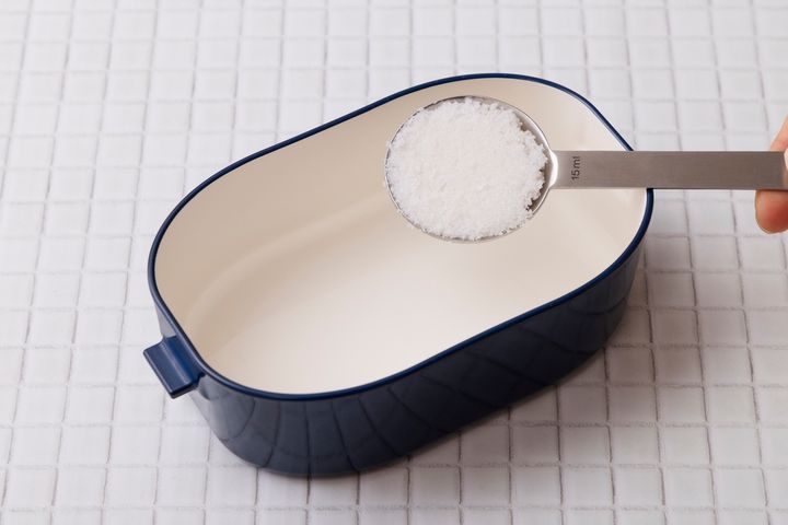 塩の浸透圧の効果で、においを吸着してくれます。塩の量は容量約500mlの弁当箱なら大さじ1、深型や大きめの約1000mlなら大さじ2を目安に、容量によって加減して。
