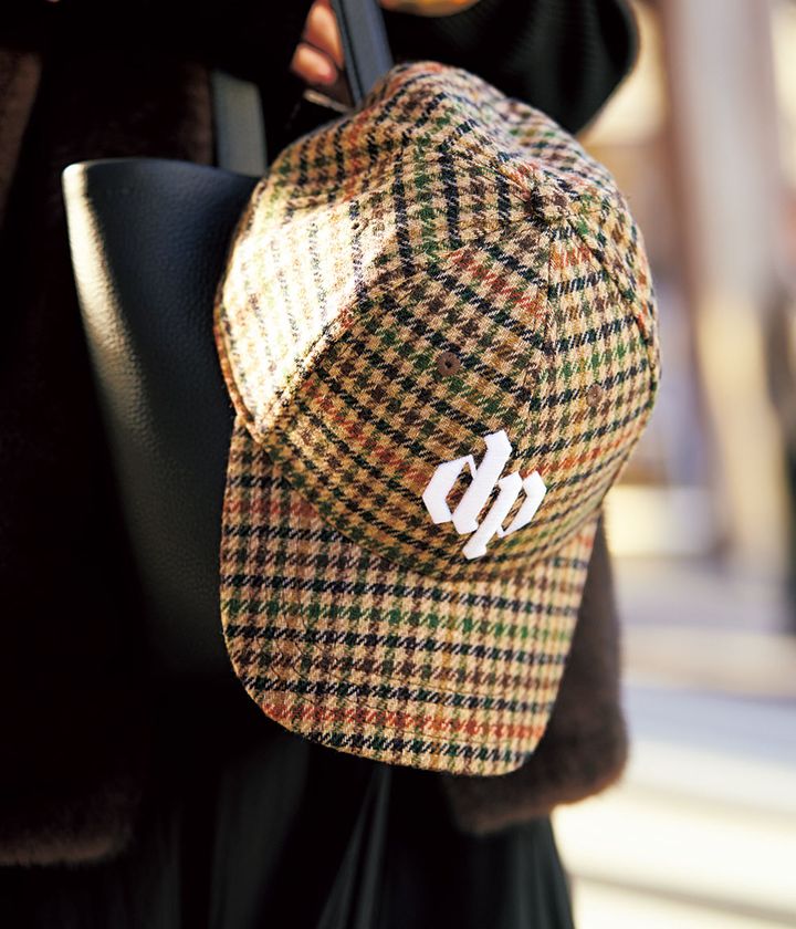 重たくなりがちな冬のコーディネートに軽さを出すために、DARKPARKのチェック柄キャップをアクセントにしました。