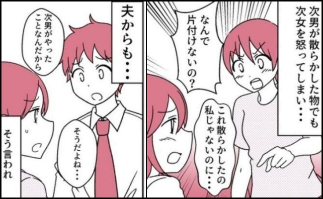私は次女の遊びが行き過ぎて怒ってしまうこともあるのですが、そういうとき以外で、あきらかに次男がしたことなのに次女を怒ってしまうことも……。おもちゃのお片づけは次女がやってくれて頼っているのに、家事で忙しい私は、散らかしっ放しを見るとついつい怒ってしまうのです。