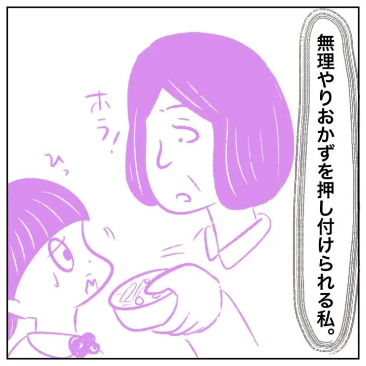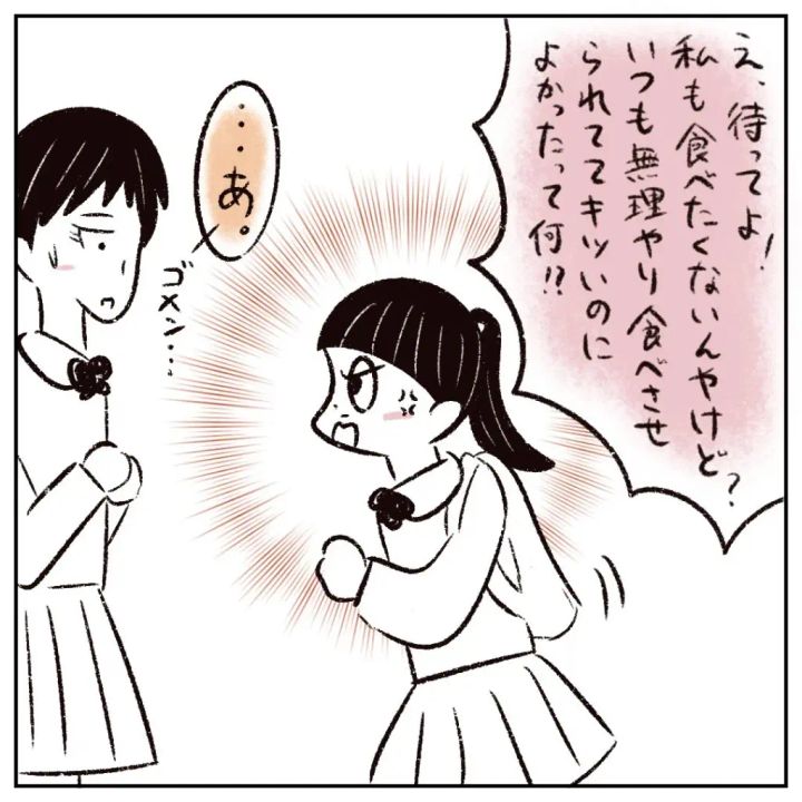 友達の言葉を聞いて、「え、待ってよ!私も食べたくないんやけど?いつも無理やり食べさせられてキツいのに、よかったって何!?」と怒りを露わにすると、「・・あ、ゴメン」と謝るのでした。
