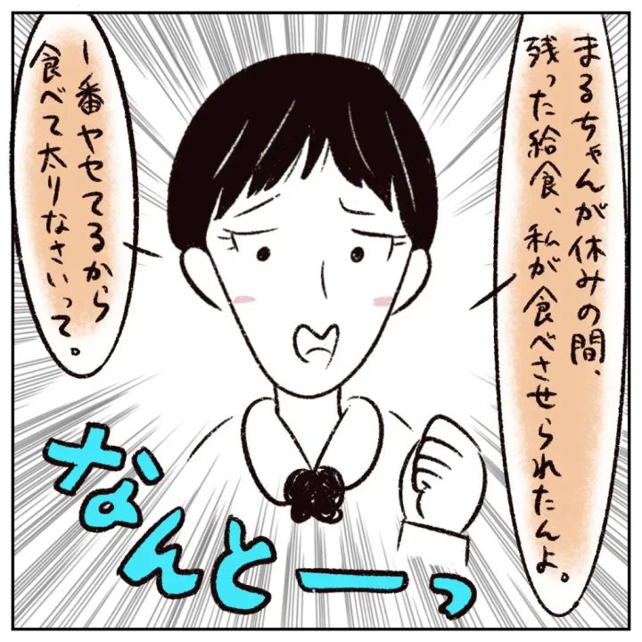 すると、「まるちゃんが休みの間、残った給食、私が食べさせられたんよ。1番ヤセてるから食べて太りなさいって」と被害を訴える友達。