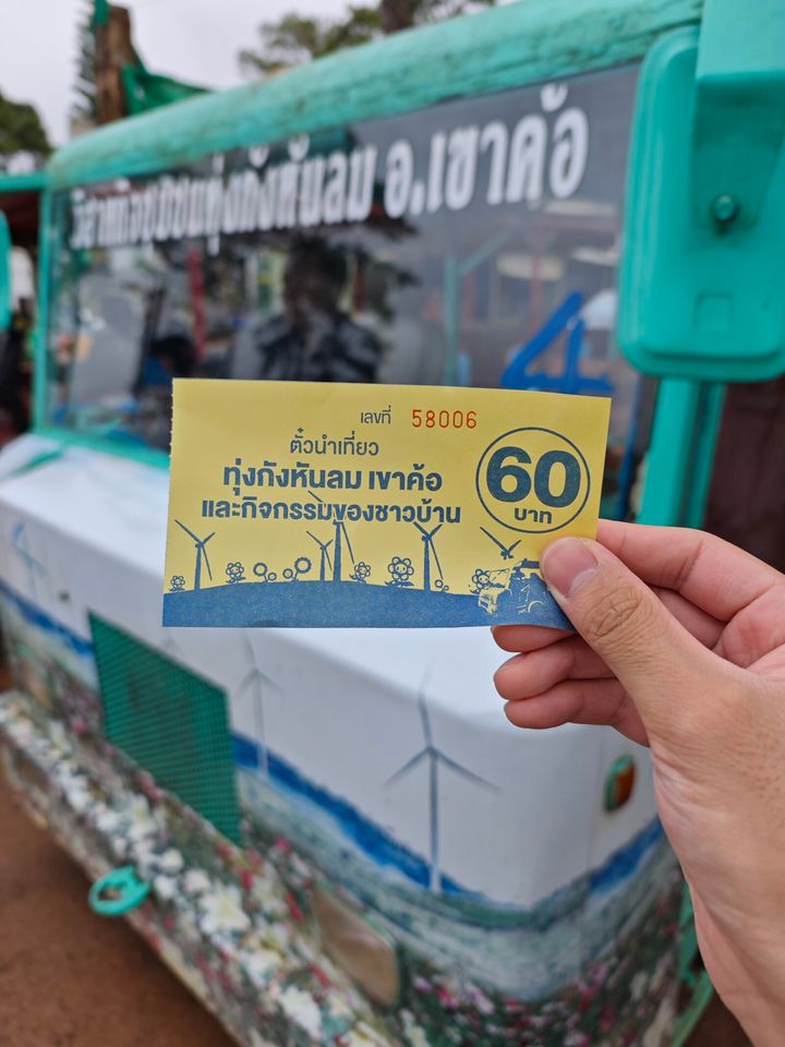 風力発電ツアーに1人60バーツで参加することができます。ツアーは観光用カートに乗って。