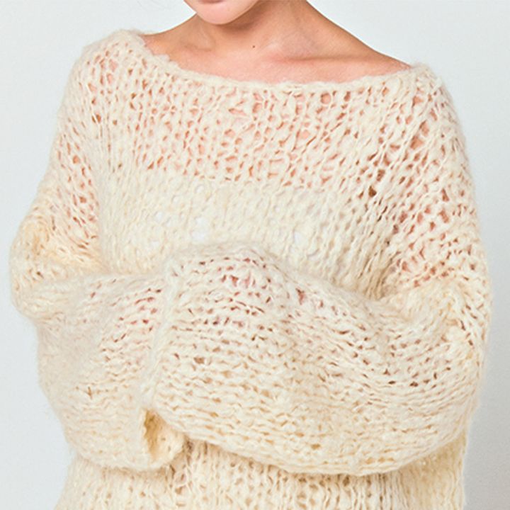 〈吉田さん〉イウエン マトフの白ニットはカジュアルなかぎ針編みでありながらも、衿元が広く女性らしく着こなせるのがお気に入り。息子たちと一緒だとふざけて編み目を拡張されそうなので(笑)、一人時間用に重宝しています。