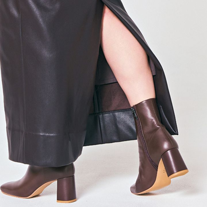 〈遠藤さん〉動きやすさ最重視の生活で週7スニーカー派ですが、夜会の日はレザースカートに合わせてDIANAのヒールブーツをセレクト。レディ度を高めてテンションを上げます。ピンクのファーアウターはTATRAS。