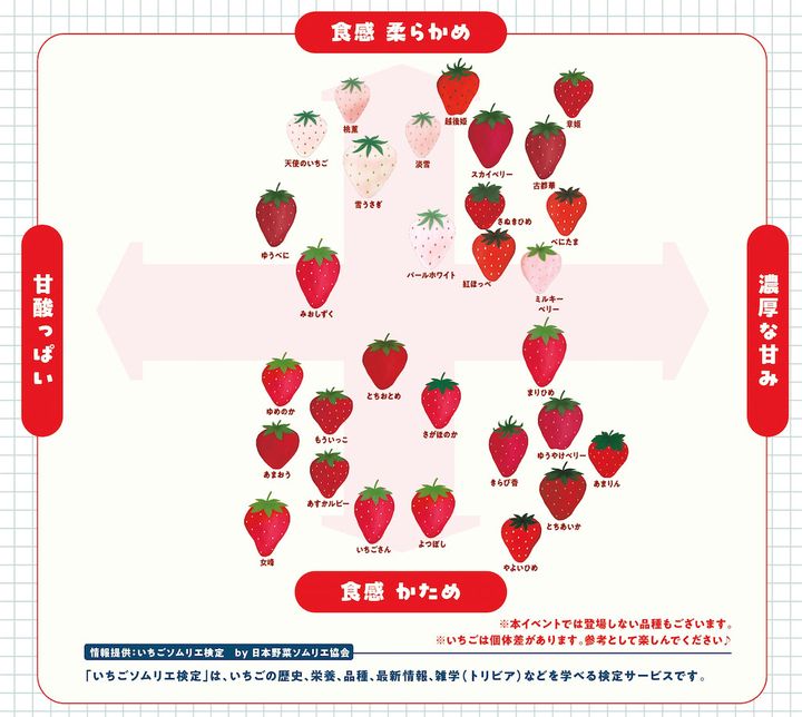 会場内には、いちごソムリエ監修の「食感」と「味わい」を軸にした、いちごのチャート図が登場します!これを見れば、お好みのいちごがきっと見つかるはず!