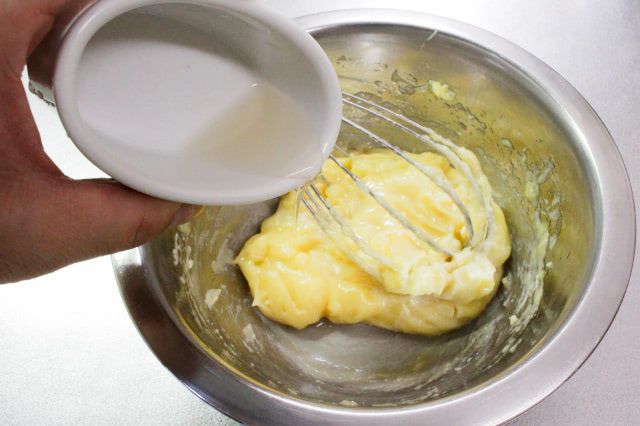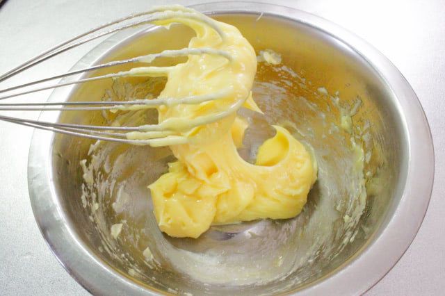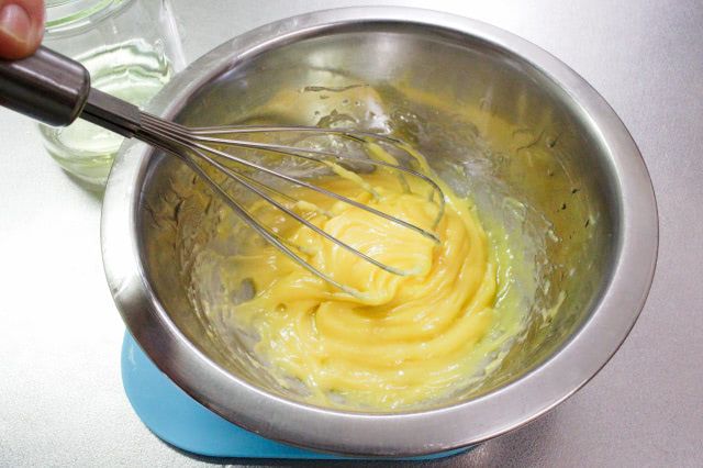 最初はとろとろでしたがサラダ油を加えるごとに硬くなっていき、サラダ油を半分ほど加えるとカスタードクリームのような硬さになりました。色も黄色からクリーム色に変化しました。
