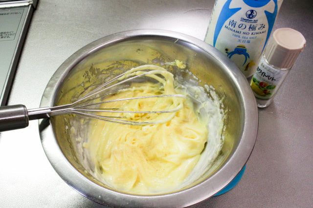 サラダ油をすべて加えると、泡立て器で持ち上げられるくらいの硬さに変化。サラサラのサラダ油をたっぷりと加えたのでとろとろになるかと思いきや、硬くなったのが不思議です。