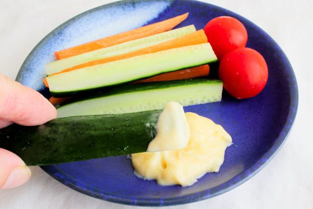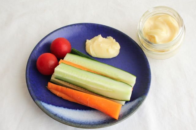 きゅうりスティックやにんじんスティックに付けても、ポタッと落ちることはなく、しっかりとまとわりつく感じとややクリーム色っぽい白色は市販品にそっくりで、完成度の高い「自家製マヨネーズ」になりました♪