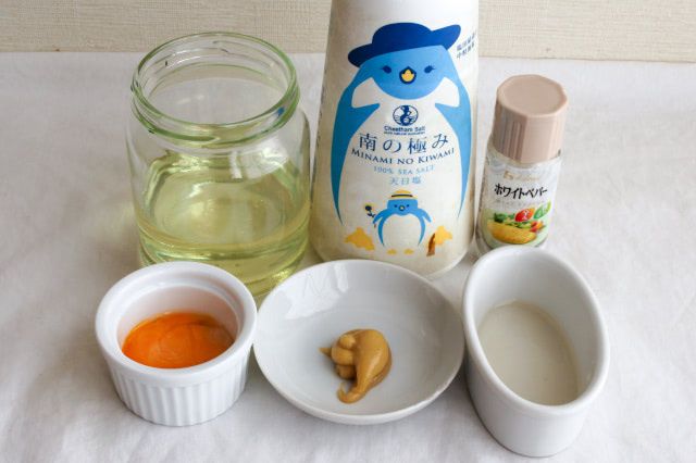 マヨネーズの基本の材料は卵黄、サラダ油、酢ですが、練り辛子を加えるのが三國シェフ流ですね。動画では、粒無しのマスタードでも良いと言っていたので、家庭で作りやすいように辛子を加えたレシピを紹介していたのでしょうね。