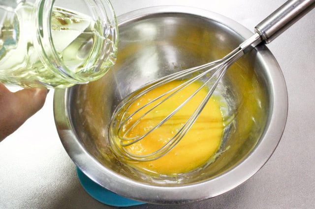 2. 卵黄を混ぜながらサラダ油を少しずつ加えます。