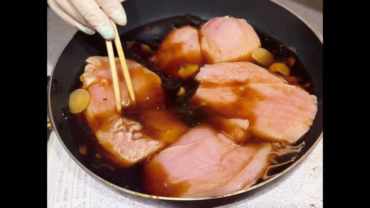 鍋の調味液がふつふつと煮立ってきたら、鶏むね肉を投入します。まず、8分煮て、裏っ返して8分煮て、さらにふたをして10分煮ます。