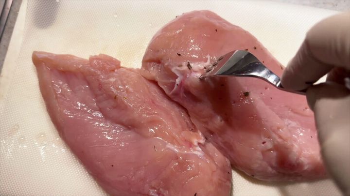 クレイジーソルトをまぶして下味をつけた鶏むね肉に、さらに味が染み込むようにフォークを刺していきます。
