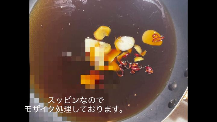 鍋に味ぽん、水、砂糖、スライスしたにんにくとしょうが、輪切りにした赤唐辛子を入れ煮込んでいきます。