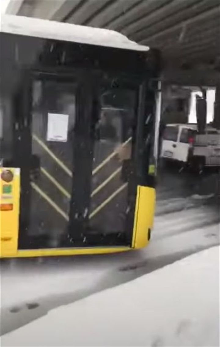 凍結した道路でスリップしたバス。