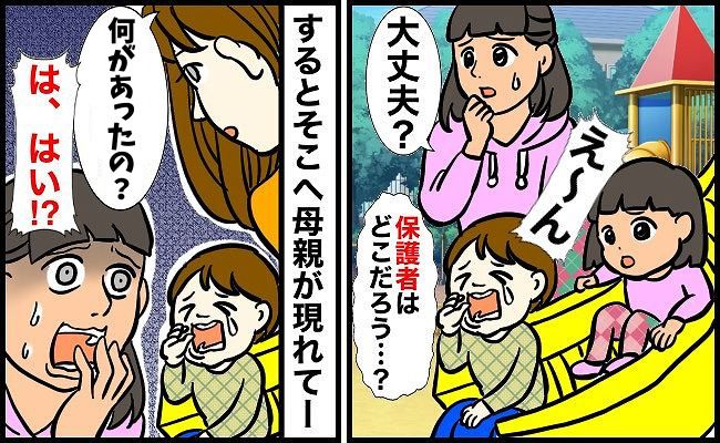 先日3歳の娘が公園のすべり台で遊んでいたら、娘の前をすべっていた子どもが姿勢を崩して泣いてしまいました。その子の親が近くにいなかったので心配していたら、母親らしき人が駆け寄ってきて――!?