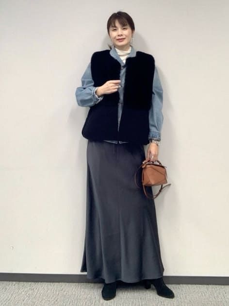 デニムに重ねたのはラビット風のエコファーとウール素材を使った切り替えジレ。ツヤ感のあるブラックが大人なシックさ演出した今年らしいアイテムです。デニムジャケットをインすることで、防寒もオシャレも両得したコーデに仕上げました。