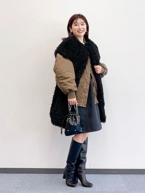 春秋用の薄手のアウターにファーコートを重ねて真冬も使えるあったかスタイルに。気温が高めの日は、ロングTシャツやニットと組み合わせてカスタマイズを楽しめるアイテムです。今回はコーデを引き締めるブラックにカーキのブルゾン合わせでトレンド感抜群のコーデに仕上げました。