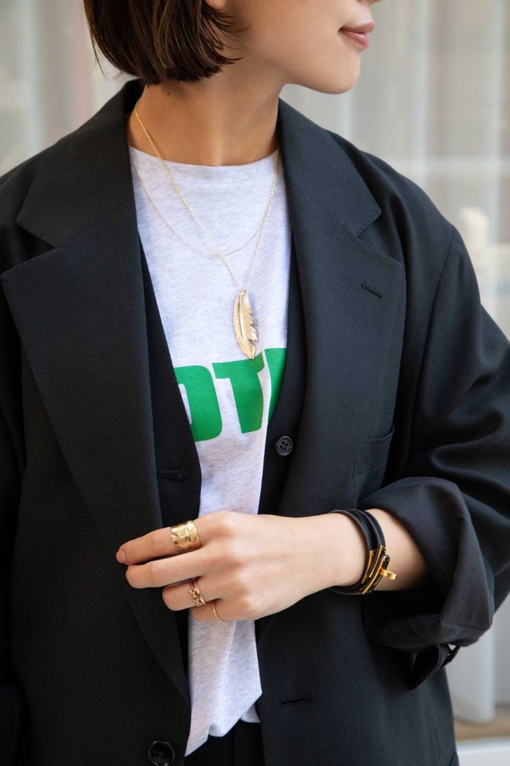 「シンプルなコーディネートが多いので、アクセサリーは必須。ゴールドで統一することで重ね付けしてもまとまった印象に」デニム¥23,100(プラージュ/Plage 代官山店)