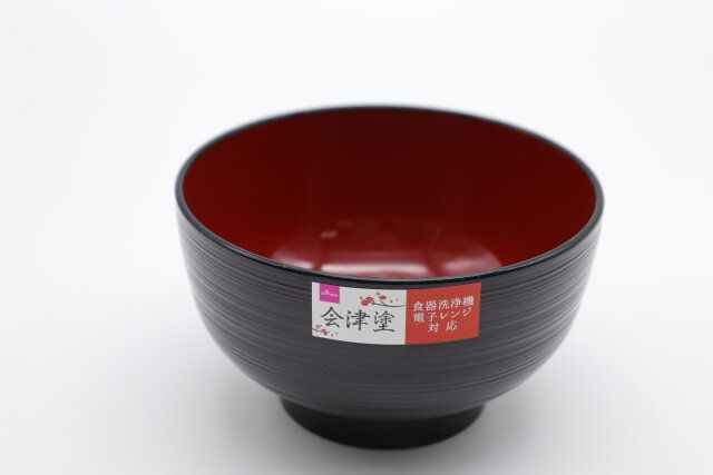 それが、ひときわ高級感を放つこちらのお椀。なんとこれ、あの伝統ある会津塗りの合成漆器で、その名も『会津塗 洗浄機対応 糸目汁椀 溜内朱』。お値段はたったの¥110(税込)です!
